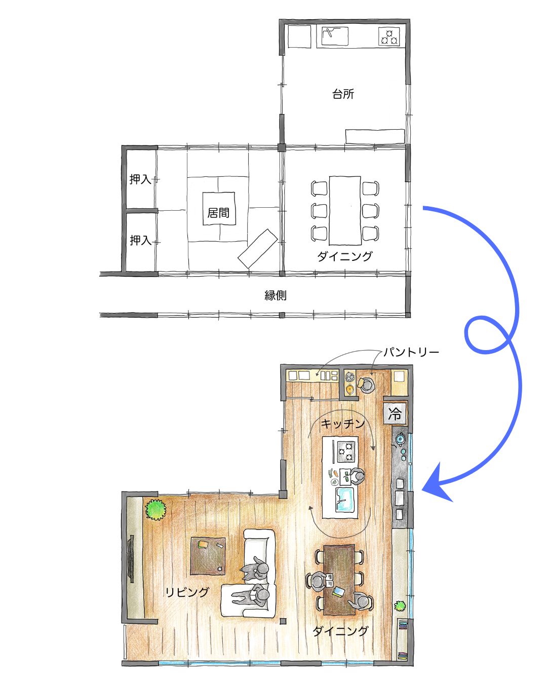 既存の間取りを活かしつつ、今の暮らしに合った間取りに改修することで、古民家はぐっと住みやすくなります。