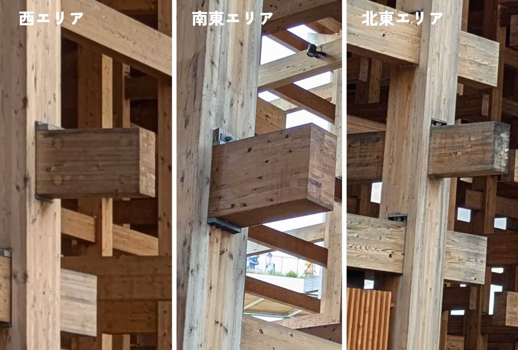 現地でよく見てみると、柱と梁の接合部分の異なる納まりを確認できました。