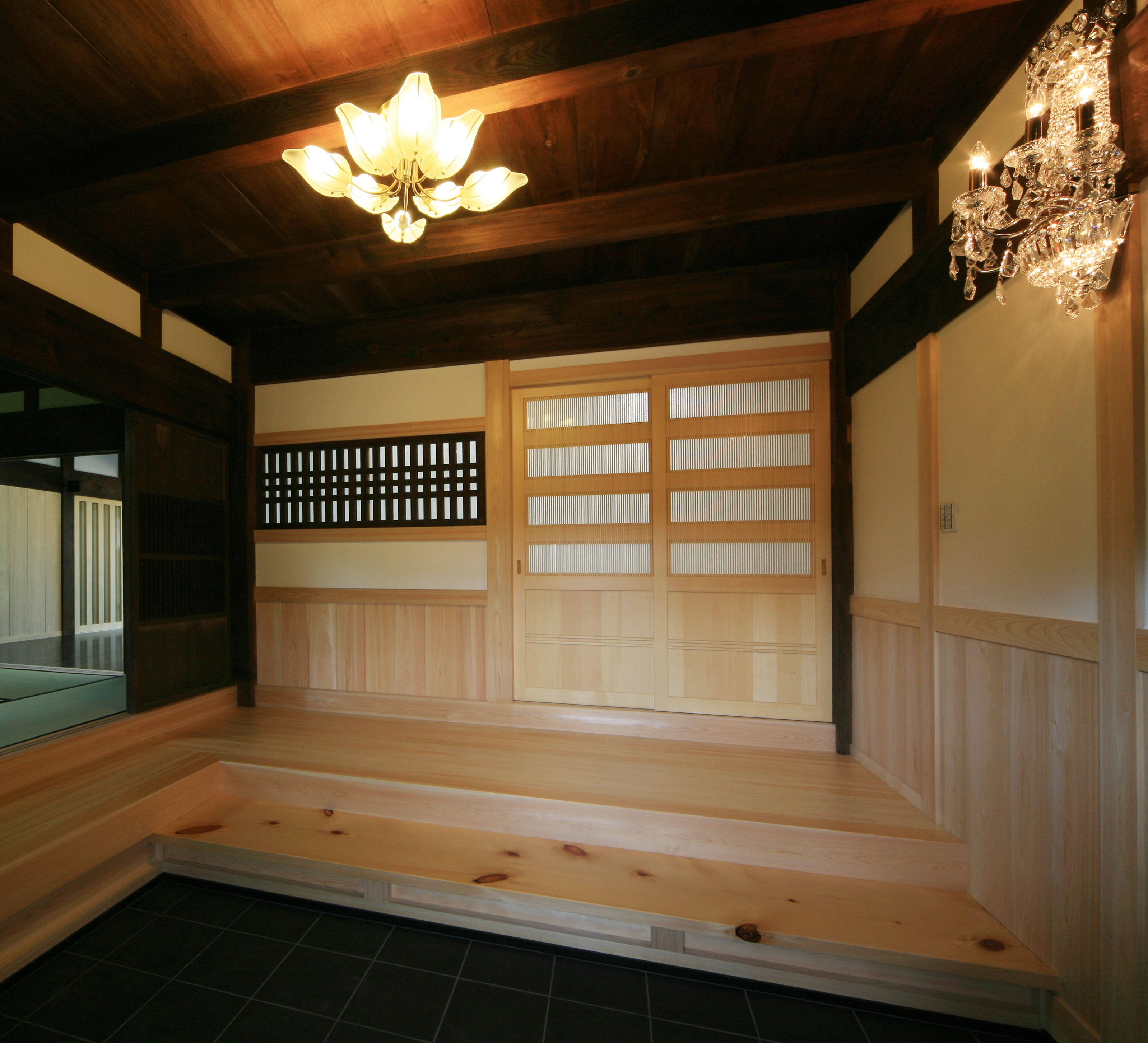 築80年の古民家の玄関に、あえてガラスの煌めきを添えることで再生の象徴となる空間に。